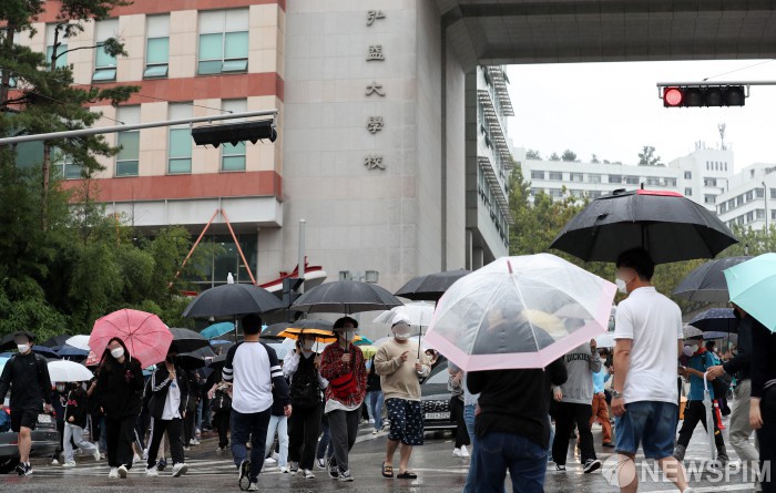 [서울=뉴스핌] 정일구 기자 = 전국 대부분 지역에 비가 내린 10일 오후 서울 마포구 홍익대학교에서 2022학년도 수시모집 논술고사를 마친 수험생들이 캠퍼스를 나서고 있다. 2021.10.10 mironj19@newspim.com