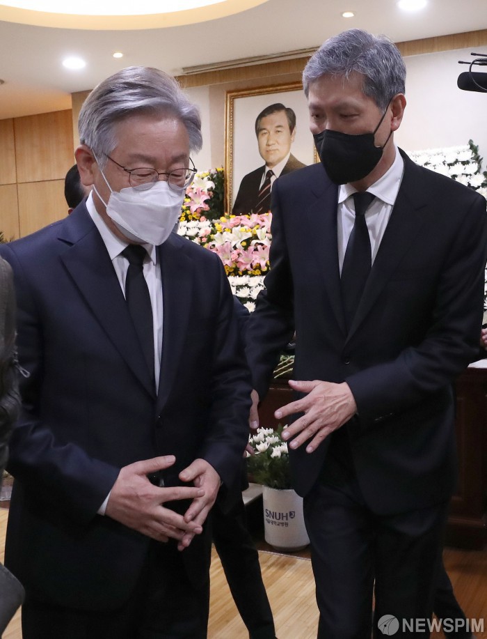 [서울=뉴스핌] 사진공동취재단 = 이재명 더불어민주당 대선 후보(왼쪽)가 27일 13대 대통령을 지낸 노태우씨 빈소가 차려진 서울대병원 장례식장에서 조문 뒤 아들 노재헌 동아시아문화센터 이사장의 안내를 받으며 나오고 있다. 2021.10.27 photo@newspim.com