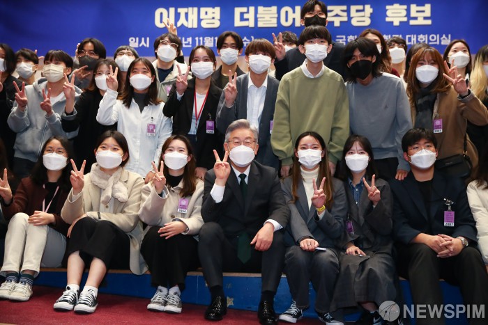 [서울=뉴스핌] 이형석 기자 = 이재명 더불어민주당 대선 후보가 17일 오후 국회 의원회관에서 열린 서울권 대학언론연합회 20대 대선후보 초청 간담회가 끝난 뒤 참석자들과 기념촬영을 하고 있다. 2021.11.17 leehs@newspim.com