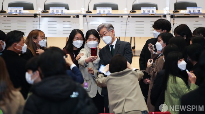 [서울=뉴스핌] 이형석 기자 = 이재명 더불어민주당 대선 후보가 17일 오후 국회 의원회관에서 열린 서울권 대학언론연합회 20대 대선후보 초청 간담회가 끝난 뒤 참석자들과 셀카를 찍고 있다. 2021.11.17 leehs@newspim.com