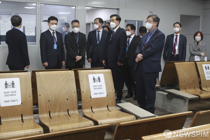 [영종도=뉴스핌] 이형석 기자 = 박광온 국회 법제사법위원장(왼쪽 두번째)이 19일 오후 인천공항 출국대기실을 찾아 운영실태를 점검하고 있다. 2021.11.19 leehs@newspim.com