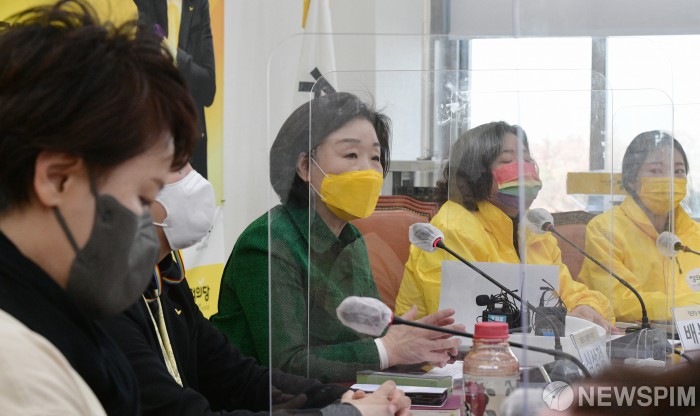[서울=뉴스핌] 최상수 기자 = 심상정 정의당 대선 후보가 25일 국회에서 열린 젠더 폭력 관련 단체 현장의 목소리 청취 간담회에 참석, 인사말을 하고 있다. 2021.11.25 kilroy023@newspim.com