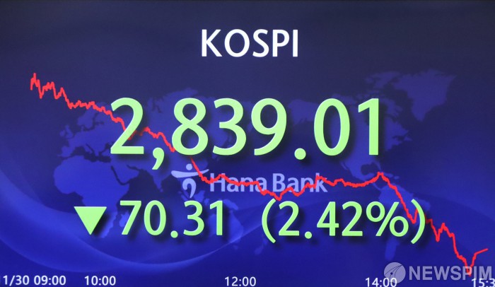 [서울=뉴스핌] 김민지 인턴기자 = 30일 코스피는 전 거래일(2909.32)보다 70.31포인트(2.42%) 내린 2839.01에 장을 마쳤다. 코스닥지수는 전 거래일(992.34)보다 26.71포인트(2.69%) 하락한 965.63에, 원·달러 환율은 전 거래일(1193.0원)보다 5.1원 내린 1187.9원에 문을 닫았다. 사진은 이날 오후 하나은행 딜링룸 모습. 2021.11.30 kimkim@newspim.com
