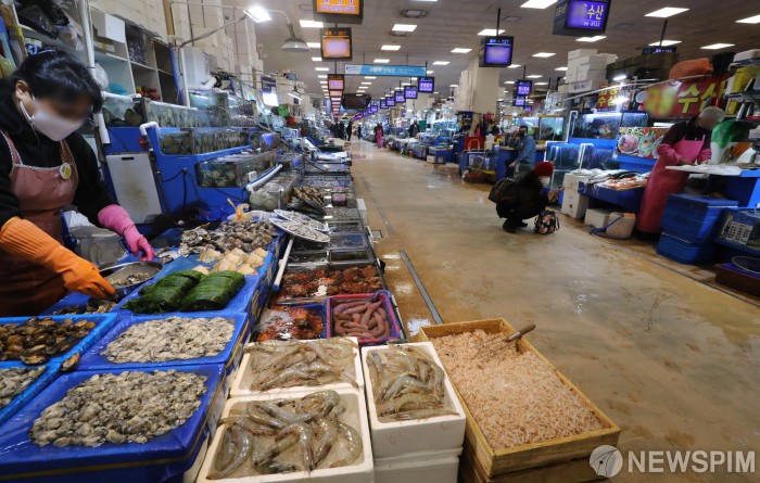 [서울=뉴스핌] 김학선 기자 = 코로나19 신규 확진자 5천명대, 위중증 환자 700명대로 최다를 기록한 1일 오후 서울 노량진 수산시장의 상인들이 장사 준비를 하고 있는 가운데 찾는 손님이 없어 한산한 모습을 보이고 있다. 2021.12.01 yooksa@newspim.com