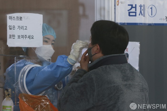 [서울=뉴스핌] 이형석 기자 = 코로나19 신규 확진자 수가 5,128명으로 집계된 5일 오전 서울 중구 서울역 광장에 마련된 선별진료소를 찾은 시민들이 검사를 받고 있다. 5일 0시 기준 국내 오미크론 감염 환자는 3명이 늘어 총 12명이다. 2021.12.05 leehs@newspim.com