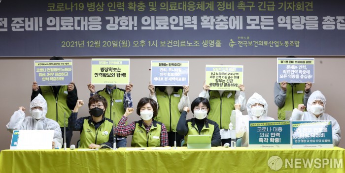 [서울=뉴스핌] 정일구 기자 = 보건의료노조 관계자들이 20일 오후 서울 영등포구 보건의료노조 생명홀에서 코로나19 병상 인력 확충 및 의료대응체계 정비 촉구 긴급 기자회견을 열고 구호를 외치고 있다. 2021.12.20 mironj19@newspim.com