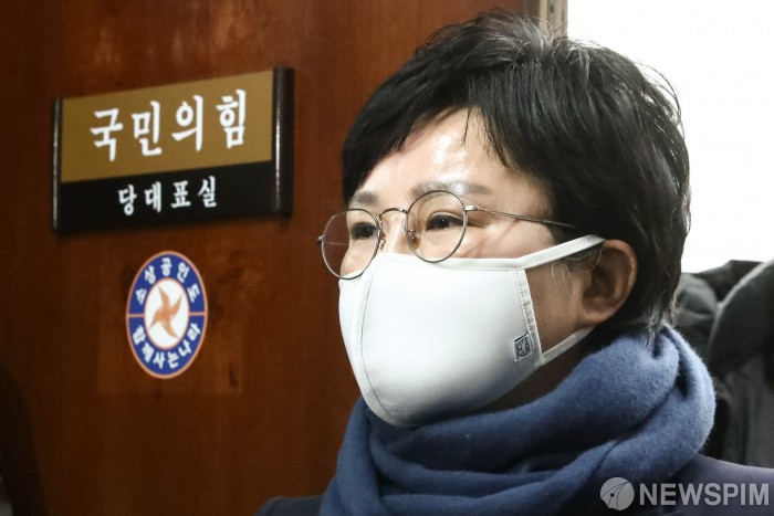 [서울=뉴스핌] 이형석 기자 = 조수진 국민의힘 의원이 21일 오후 서울 여의도 국회 국민의힘 당대표실에서 이준석 대표와 만나지 못하고 나오며 취재진의 질문에 답하고 있다. 2021.12.21 leehs@newspim.com