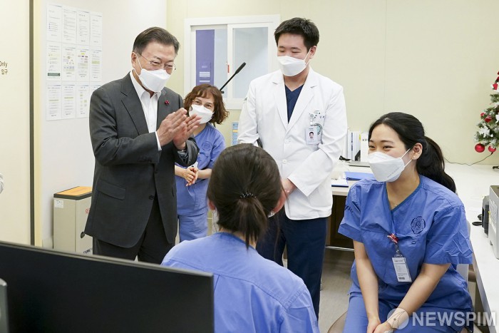 [서울=뉴스핌] 문재인 대통령이 24일 서울 강서구 이화여자대학교 의과대학 부속 서울병원을 방문해 의료진을 격려하고 있다. [사진=청와대] 2021.12.24 photo@newspim.com