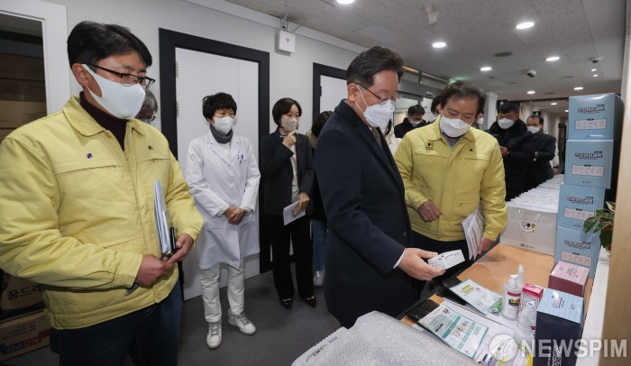 [서울=뉴스핌] 최상수 기자 = 이재명 더불어민주당 대선 후보가 25일 서울 강남구 보건소 재택치료 모니터링 센터를 방문하여 건강관리세트를 살펴보고 있다. 2021.12.25 kilroy023@newspim.com