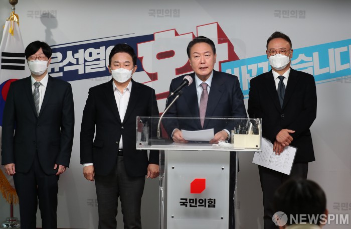 [서울=뉴스핌] 윤창빈 기자 = 윤석열 국민의힘 대선 후보가 26일 서울 여의도 중앙당사에서 열린 '상식 회복 공약-성장과 복지의 선순환' 관련 기자회견에서 공약을 발표하고 있다. 2021.12.26 pangbin@newspim.com