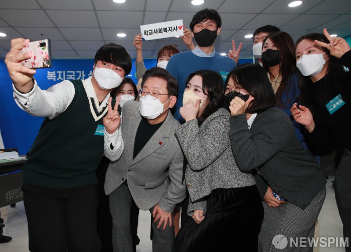 [서울=뉴스핌] 국회사진취재단 = 이재명 더불어민주당 대선후보가 28일 오전 서울 영등포구 문래동 한국사회복지사협회에서 열린 복지국가실천연대 간담회 ‘청년 그리고 사회복지사를 만나다’에서 간담회가 끝난 후 사회복지사들과 기념촬영을 하고 있다. 2021.12.28 photo@newspim.com
