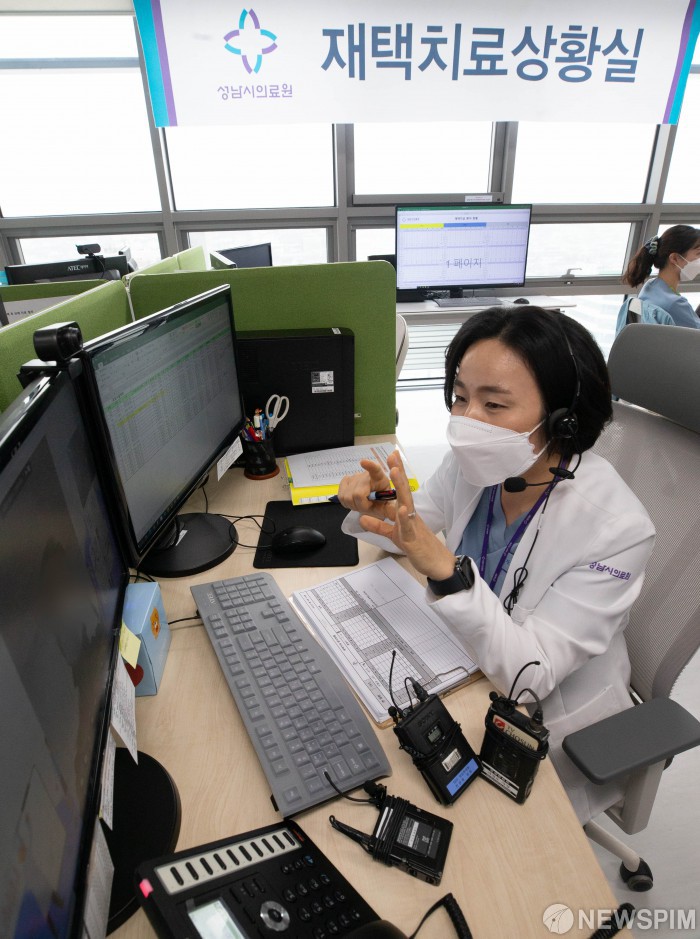 [성남=뉴스핌] 윤창빈 기자 = 지난 19일 오후 경기 성남시 성남시의료원 재택치료상황실에서 의료진이 코로나19 재택치료 환자와 비대면 진료를 하고 있다. 의료진은 비대면 진료를 통해 팍스로비드 투약이 필요하다고 판단되면 환자에게 처방을 할 수 있다. 처방전을 전송받은 약국은 약을 조제해 환자에게 배송한다. 2022.01.21 pangbin@newspim.com