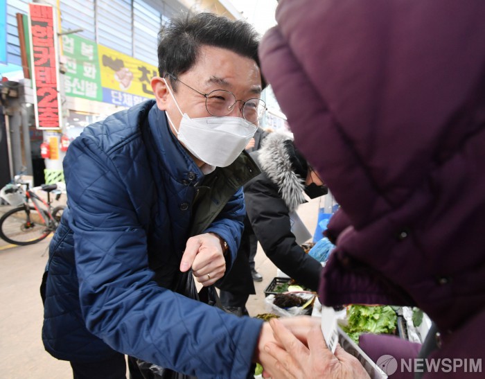 [서울=뉴스핌] 이억원 기획재정부 차관이 21일 천안시 소재 천안 중앙시장을 방문해 시장 상인과 인사를 나누고 있다. [사진=기획재정부] 2022.01.21 photo@newspim.com