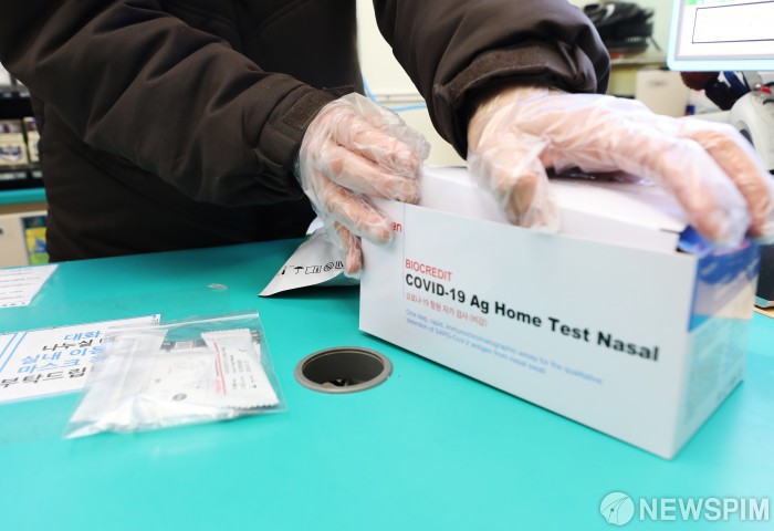 [서울=뉴스핌] 김민지 기자 = 오늘부터 편의점과 약국에서 코로나19 자가검사키트를 개당 6000원에 구매할 수 있다. 대용량 포장이 아닌 낱개로 소분 판매되는 제품으로, 1인당 1회 5개로 제한된다. 사진은 이날 오후 서울 서대문구 GS25 연대2점에서 직원이 자가검사키트를 소분하는 모습. 2022.02.15 kimkim@newspim.com