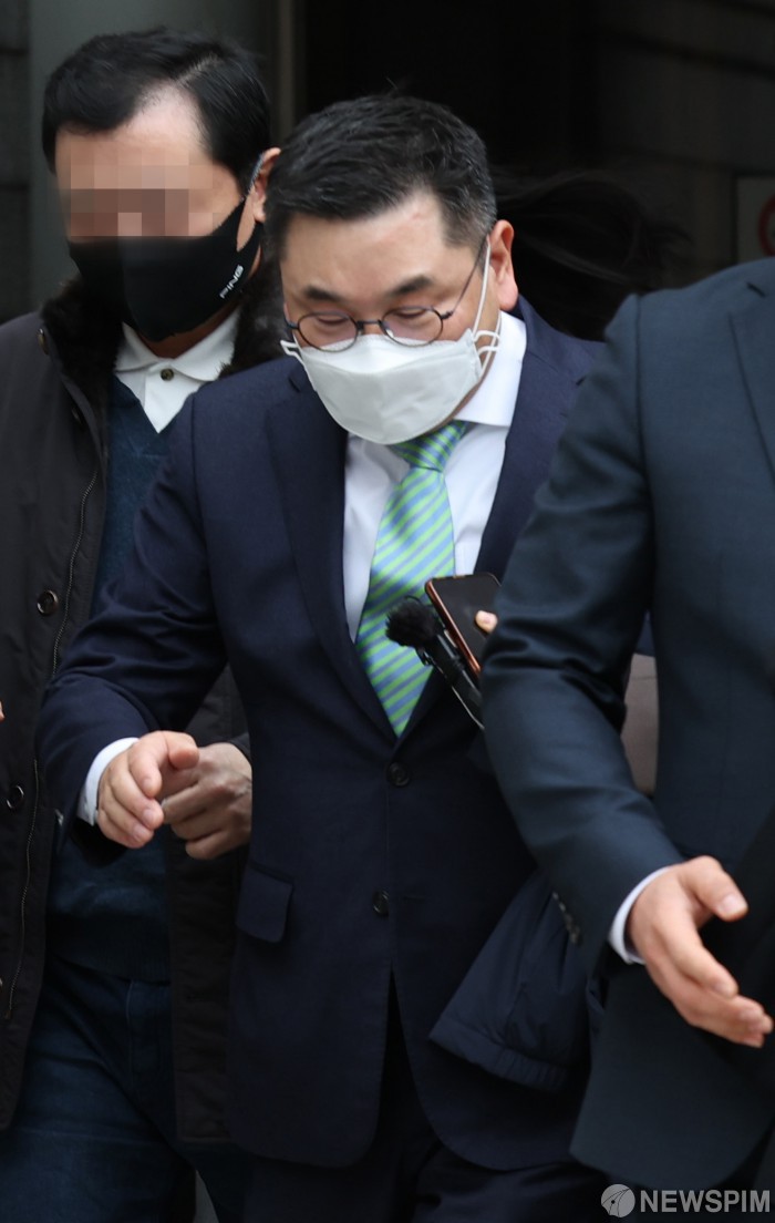 [서울=뉴스핌] 윤창빈 기자 = 주식 저가 매매를 통해 1300억원대 조세를 포탈한 혐의를 받고 있는 구본상 LIG그룹 회장이 15일 오후 서울 서초구 서울중앙지방법원에서 열린 1심 선고 공판을 마치고 법원을 나서고 있다. 이날 구본상 LIG그룹 회장은 1심에서 무죄를 선고받았다. 2022.02.15 pangbin@newspim.com