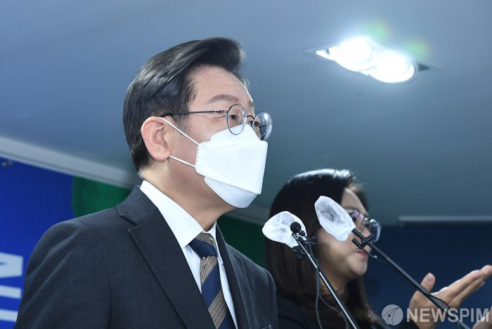 [서울=뉴스핌] 최상수 기자 = 이재명 더불어민주당 대선 후보가 21일 서울 여의도 중앙 당사에서 ‘코로나 피해 극복과 대응 방안’ 관련 기자회견을 하고 있다. 2022.02.21 kilroy023@newspim.com