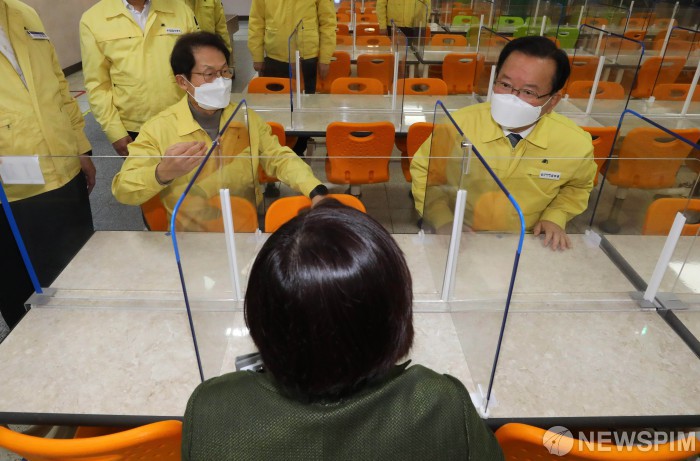 [서울=뉴스핌] 윤창빈 기자 = 학교 방역 현장점검에 나선 김부겸(오른쪽) 국무총리가 2일 오후 서울 마포구 염리초등학교를 방문해 조희연 서울시교육감과 급식실을 둘러보고 있다. 2022.03.02 pangbin@newspim.com