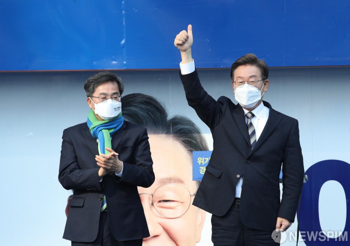 [서울=뉴스핌] 국회사진취재단 = 이재명 더불어민주당 후보(오른쪽)와 김동연 새로운물결 당 대표가 3일 오후 서울 영등포구 타임스퀘어 광장에서 열린 유세에서 함께 입장, 시민들에게 인사하고 있다. 2022.03.03 photo@newspim.com