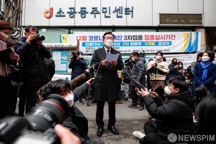 [서울=뉴스핌] 국회사진취재단 = 제20대 대통령선거 사전투표가 시작된 4일 서울 중구 소공동주민센터에 마련된 투표소에서 이재명 더불어민주당 대선후보가 투표를 마친 뒤 입장을 발표하고 있다. 2022.03.04 photo@newspim.com