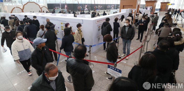 [서울=뉴스핌] 김학선 기자 = 제20대 대통령선거 사전투표 첫날인 4일 오후 서울역 대합실에 마련된 남영동 사전투표소에서 시민들이 투표를 하고 있다. 사전투표는 이날부터 5일까지 이틀간 전국 3천552개 투표소에서 오전 6시부터 오후 6까지 진행된다. 2022.03.04 yooksa@newspim.com