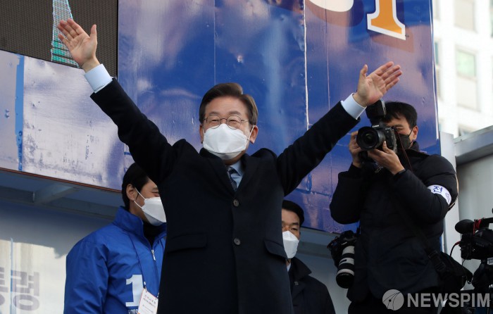 [서울=뉴스핌] 국회사진취재단 = 이재명 더불어민주당 대선 후보가 6일 오후 서울 은평구 응암역 인근에서 유세를 하며 지지를 호소하고 있다. 2022.03.06 photo@newspim.com