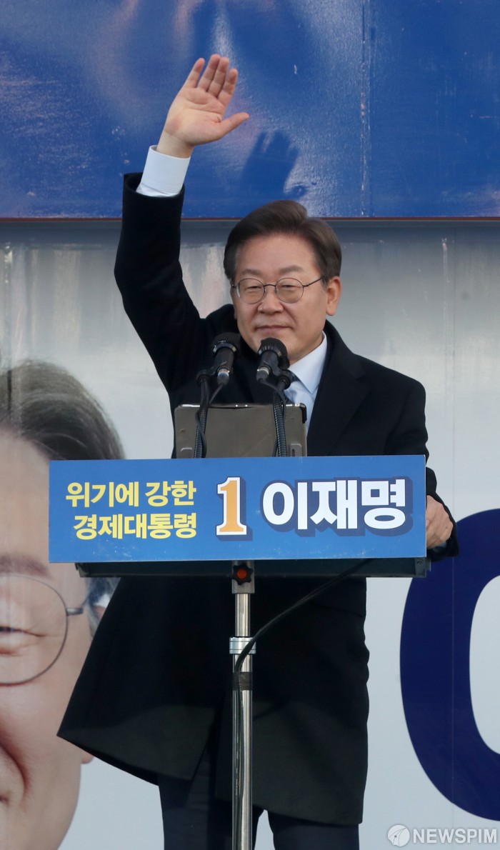 [서울=뉴스핌] 국회사진취재단 = 이재명 더불어민주당 대선 후보가 6일 오후 서울 은평구 응암역 인근에서 유세를 하며 지지를 호소하고 있다. 2022.03.06 photo@newspim.com