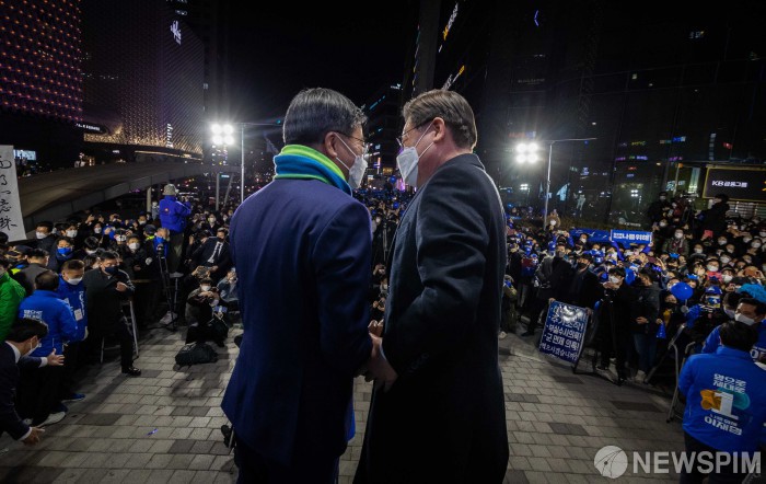 [대전=뉴스핌] 이형석 기자 = 이재명 더불어민주당 대선 후보가 지지에 나선 김동연 전 새로운물결 대선 후보와 함께 7일 오후 대전 서구 둔산갤러리아 앞 유세에서 인사를 하고 있다. 2022.03.07 leehs@newspim.com