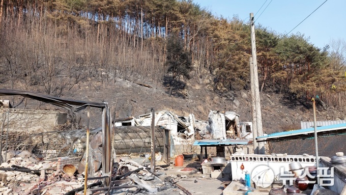 | [울진=뉴스핌] 남효선 기자 = 8일째 확산되고 있는 '울진산불'로 삶의 터전이 하루아침에 잿더미로 변하면서 폐허가 된 북면 검성리 마을 등 피해마을.2022.03.11 nulcheon@newspim.com |