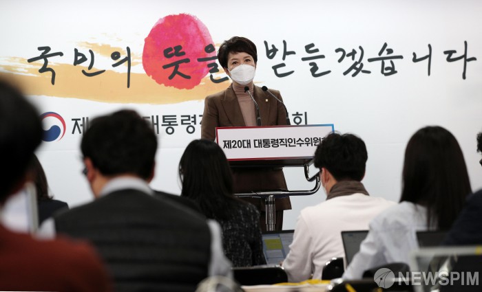 [서울=뉴스핌] 인수위사진기자단 = 김은혜 대변인이 31일 서울 종로구 통의동 제20대 대통령직인수위원회에서 일일 브리핑을 하고 있다. 2022.03.31 photo@newspim.com