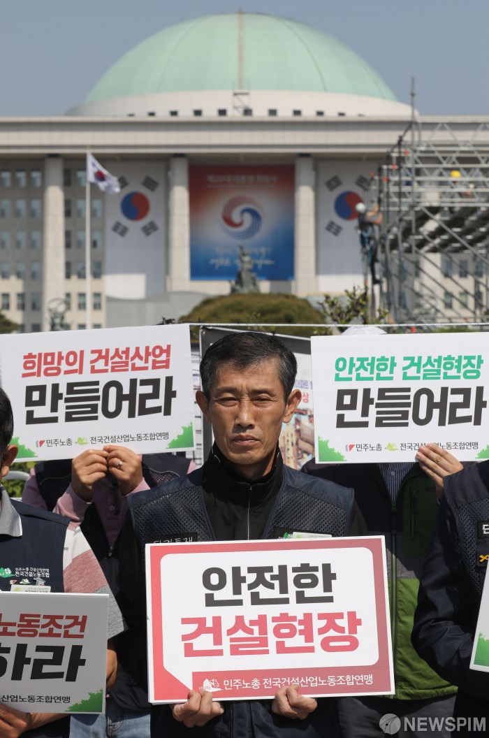 [서울=뉴스핌] 황준선 기자 = 2일 오전 서울 여의도 국회 앞에서 전국건설안전산업노동조합연맹 조합원들이 원희룡 국토교통부 장관 후보자 인사청문회에 대한 건설산업연맹 기자회견을 하고 있다. 2022.05.02 hwang@newspim.com