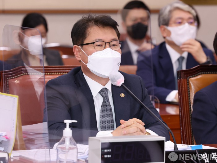 | [서울=뉴스핌] 최상수 기자 = 강성국 법무부 차관이 18일 저녁 국회 법사위에서 검찰청법과 형사소송법 등 '검수완박' 관련 법안을 심사할 법사위 제1소위원회 회의에서 의원들의 질의에 답변하고 있다. 2022.04.18 kilroy023@newspim.com |