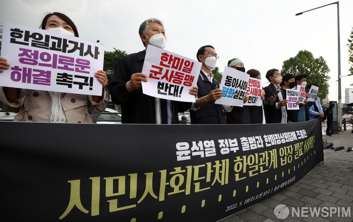 [서울=뉴스핌] 정일구 기자 = 민주노총, 정의기억연대 등 관계자들이 18일 오전 서울 용산구 대통령 집무실 인근에서 윤석열 정부 출범과 한미정상회담에 즈음한 시민사회단체 한일관계 입장 발표 기자회견을 하고 있다. 2022.05.18 mironj19@newspim.com