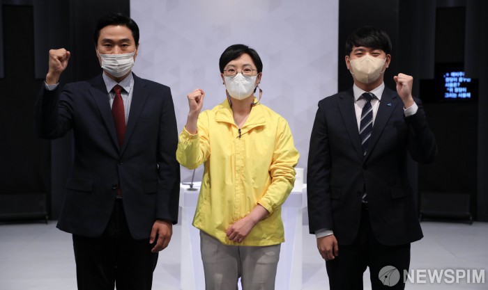 [서울=뉴스핌] 최상수 기자 = 6.1 지방선거 서울시의원 비례대표 국민의힘 이종배 후보(왼쪽부터), 정의당 오현주 후보, 더불어민주당 박강산 후보가 25일 오후 서울 마포구 상암동 SBS 스튜디오에서 열린 서울시 선거방송토론위원회 주관 서울특별시의회의원선거 비례대표 후보자토론회 시작 전 기념촬영을 하고 있다. 2022.05.25 kilroy023@newspim.com