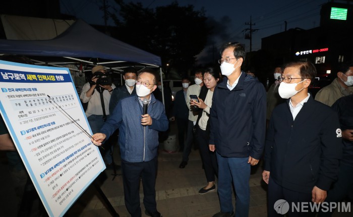 [서울=뉴스핌] 김학선 기자 = 한덕수 국무총리와 이정식 고용노동부 장관이 27일 오전 서울 남구로역 새벽인력시장을 방문해 관계자의 보고를 받고 있다. 2022.05.27 yooksa@newspim.com