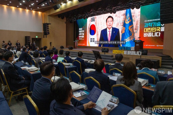 [서울=뉴스핌] 윤창빈 기자 = 윤석열 대통령이 29일 오전 서울 강남구 한국과학기술회관에서 열린 2022대한민국과학기술연차대회에서 영상으로 축사를 하고 있다. 2022.06.29 pangbin@newspim.com