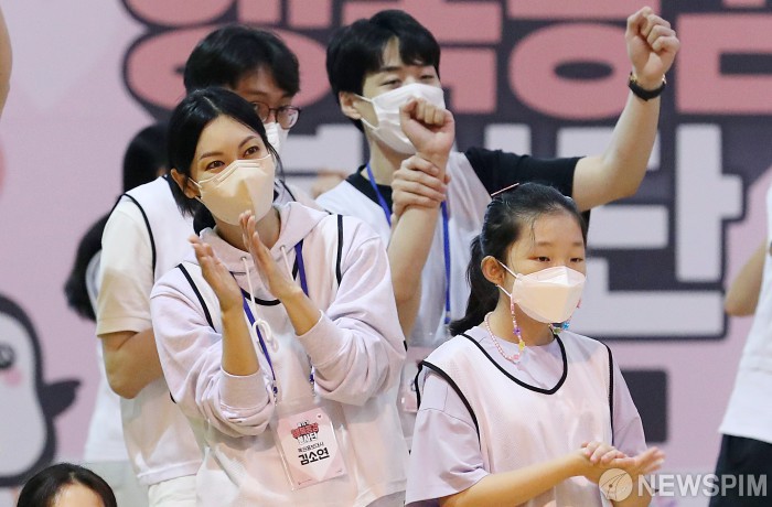[서울=뉴스핌] 정일구 기자 = 복권홍보대사 겸 행복공감봉사단장인 배우 김소연이 8일 오후 서울 서대문구 명지전문대학 실내체육관에서 열린 제15기 행복공감봉사단 2차 봉사활동 미니운동회에서 응원을 하고 있다. 2022.08.08 mironj19@newspim.com