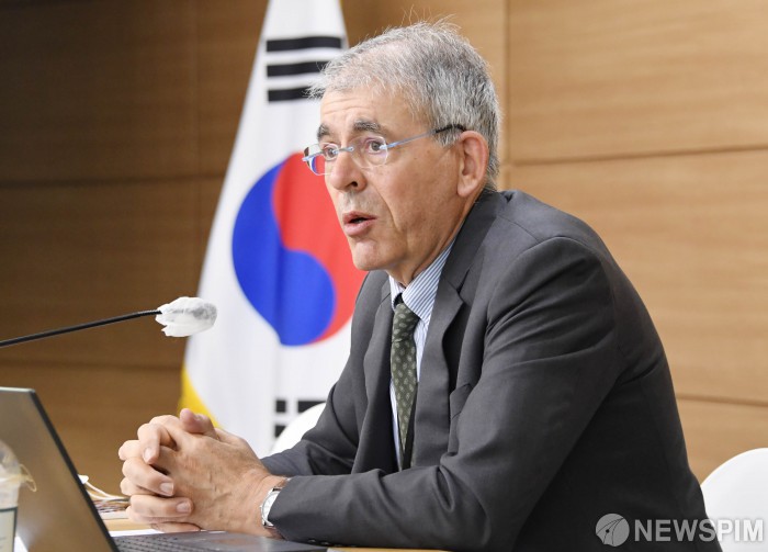 [서울=뉴스핌] 빈센트 코엔(Vincent Koen) OECD 경제검토국 부국장이 19일 정부세종청사에서 열린 'OECD 2022년 한국경제보고서 브리핑'에서 주요내용을 발표하고 있다.[사진=기획재정부] 2022.09.19 photo@newspim.com