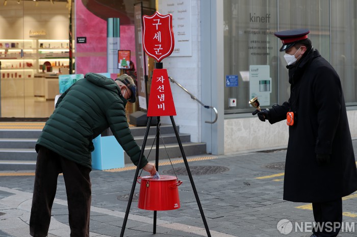 [서울=뉴스핌] 정일구 기자 = 구세군 자선냄비 모금활동이 시작된 1일 오후 서울 중구 명동거리에서 시민들이 자선냄비에 성금을 기부하고 있다. 2022.12.01 mironj19@newspim.com
