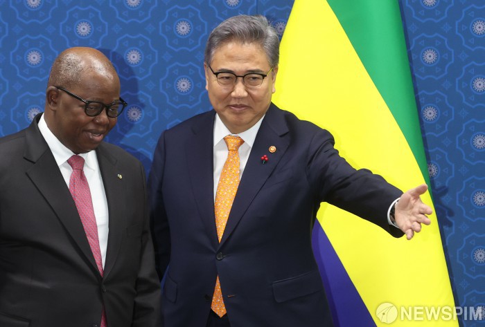 [서울=뉴스핌] 김학선 기자 = 박진 외교부 장관이 7일 서울 종로구 외교부 청사에서 열린 '한-가봉 외교장관회담'에 참석해 미카엘 무싸 아다모 가봉 외교장관과 기념촬영을 한 후 자리를 안내하고 있다. 2022.12.07 yooksa@newspim.com