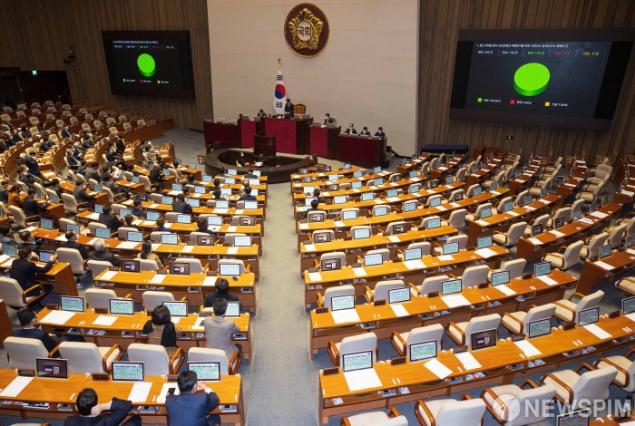 [서울=뉴스핌] 윤창빈 기자 = 30일 오후 서울 여의도 국회에서 열린 본회의에서 용산 이태원 참사 진상규명과 재발방지를 위한 국정조사 결과보고서 채택의 건이 여당 의원들이 퇴장한 가운데 가결되고 있다. 2023.01.30 pangbin@newspim.com