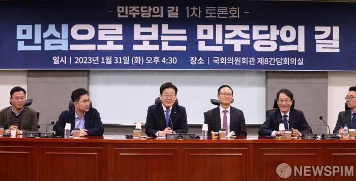 [서울=뉴스핌] 이형석 기자 = 이재명 더불어민주당 대표가 31일 오후 서울 여의도 국회 의원회관에서 열린 민주당의 길 1차 토론회에 참석해 인사말하고 있다. 2023.01.31 leehs@newspim.com