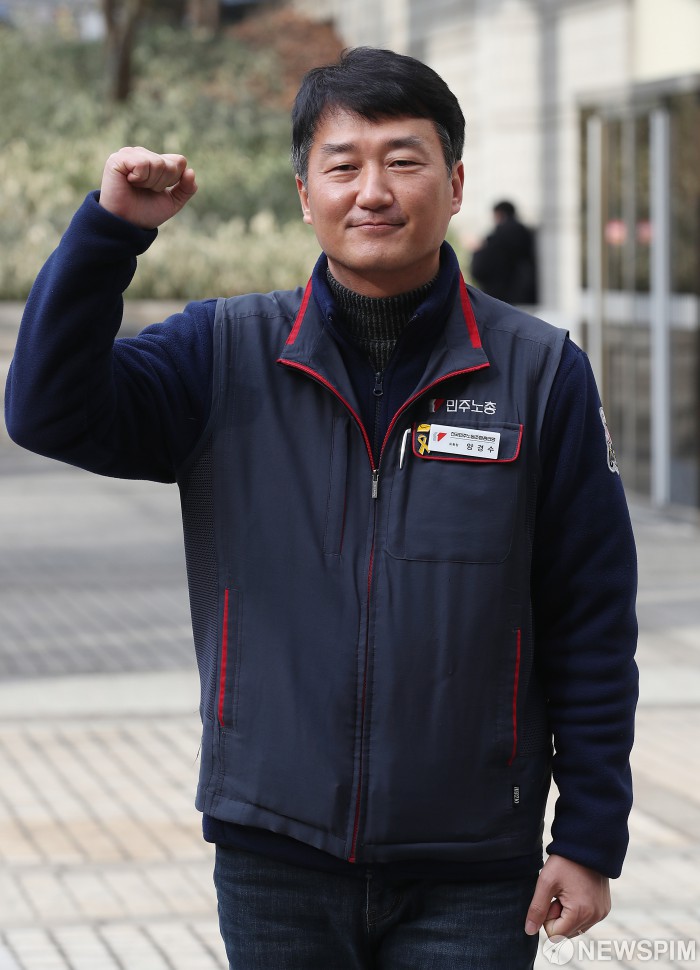 [서울=뉴스핌] 정일구 기자 = 양경수 민주노총 위원장이 9일 오후 서울 서초구 서울중앙지방법원에서 열린 '불법집회' 혐의 1심 선고 공판을 마치고 구호를 외치고 있다. 2023.02.09 mironj19@newspim.com