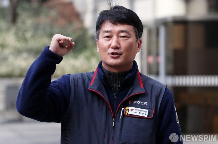[서울=뉴스핌] 정일구 기자 = 양경수 민주노총 위원장이 9일 오후 서울 서초구 서울중앙지방법원에서 열린 '불법집회' 혐의 1심 선고 공판을 마치고 구호를 외치고 있다. 2023.02.09 mironj19@newspim.com