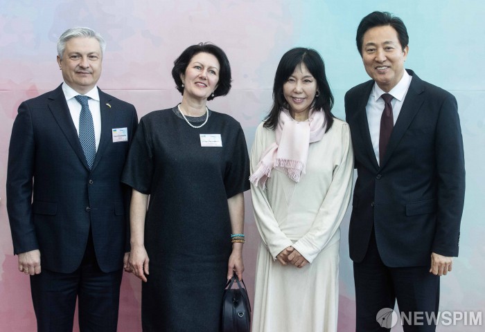 [서울=뉴스핌] 윤창빈 기자 = 오세훈 서울시장 내외가 3일 오후 서울 서초구 가빛섬에서 열린 주한대사 초청 춘계인사회에서 드미트로 포노마렌코 주한 우크라이나 대사(왼쪽) 내외와 기념촬영을 하고 있다. 2023.03.03 pangbin@newspim.com
