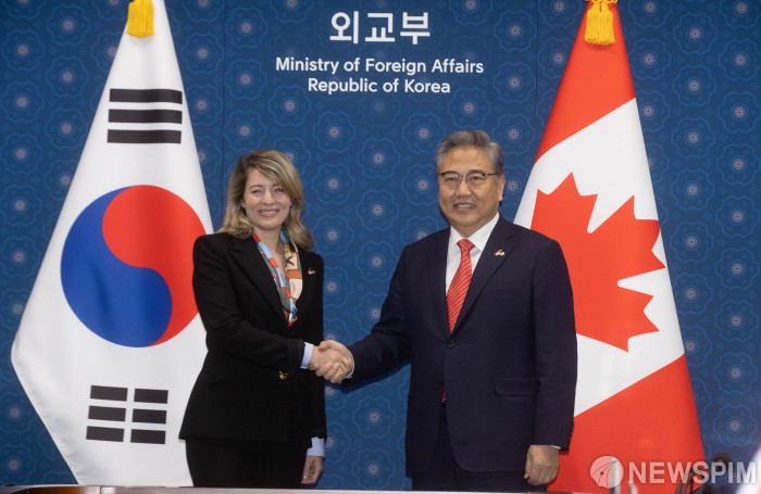 [서울=뉴스핌] 윤창빈 기자 = 박진 외교부 장관, 멜라니 졸리 캐나다 외교장관이 15일 오전 서울 종로구 외교부에서 열린 한-캐 외교장관회담에서 기념촬영을 하고 있다. 2023.04.15 pangbin@newspim.com