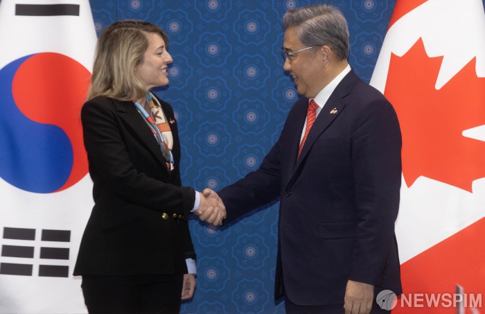 [서울=뉴스핌] 윤창빈 기자 = 박진 외교부 장관, 멜라니 졸리 캐나다 외교장관이 15일 오전 서울 종로구 외교부에서 열린 한-캐 외교장관회담에서 기념촬영을 하고 있다. 2023.04.15 pangbin@newspim.com