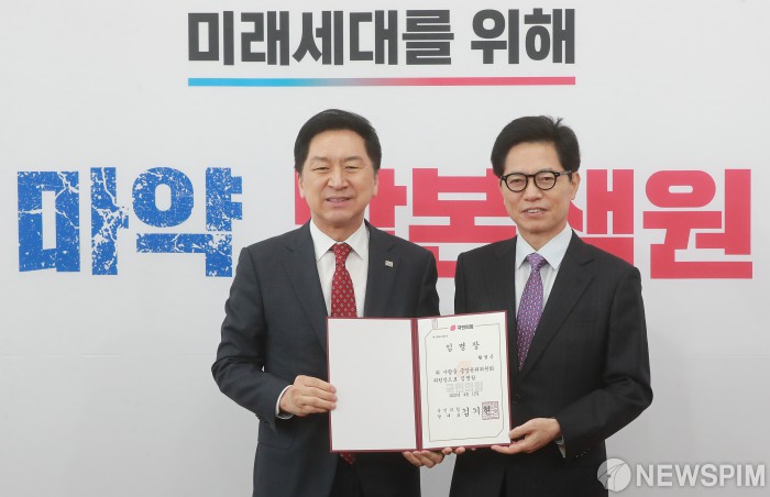 [서울=뉴스핌] 이형석 기자 = 김기현 국민의힘 대표(왼쪽)가 17일 오전 서울 여의도 국회에서 열린 주요당직자 임명장 수여식에서 황정근 중앙윤리위원회 위원장에게 임명장을 전달하고 있다. 2023.04.17 leehs@newspim.com