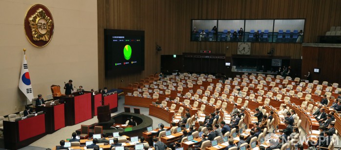 [서울=뉴스핌] 이형석 기자 = 27일 오후 서울 여의도 국회에서 열린 제405회 국회(임시회) 제05차 본회의에서 국민의힘 의원들이 퇴장한 가운데 의료법 일부개정법률안이 가결되고 있다. 2023.04.27 leehs@newspim.com