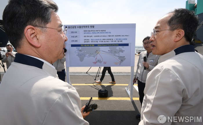 [서울=뉴스핌] 추경호 부총리 겸 기획재정부 장관이 9일 오후 전기차 생산, 수출 현장을 점검하고자 현대자동차 울산공장을 방문, 전기차 수출 선적부두를 시찰하며 관계자의 설명을 듣고 있다.[사진= 기획재정부] 2023.05.09 photo@newspim.com