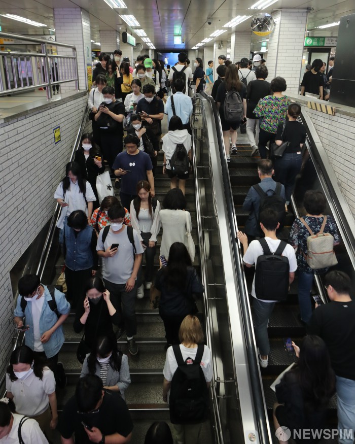 [서울=뉴스핌] 최지환 인턴기자 = 코로나19 확진자 격리 의무 해제를 하루 앞둔 31일 오전 서울 구로구 지하철 신도림역에서 시민들이 출근길 발걸음을 재촉하고 있다. 정부는 내달 1일 0시부터 코로나19 위기경보 단계를 '심각'에서 '경계'로 하향 조정한다. 이에 따라 코로나19 대응을 총괄했던 중앙재난안전대책본부는 오늘부로 해체한다. 2023.05.31 choipix16@newspim.com